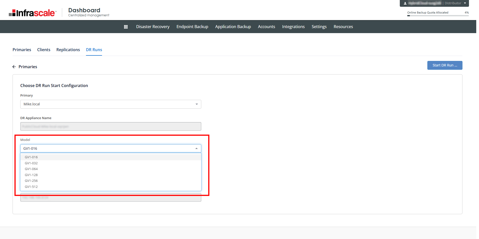 4) Designate the specifications of the DR Appliance by selecting a Model from the dropdown menu.