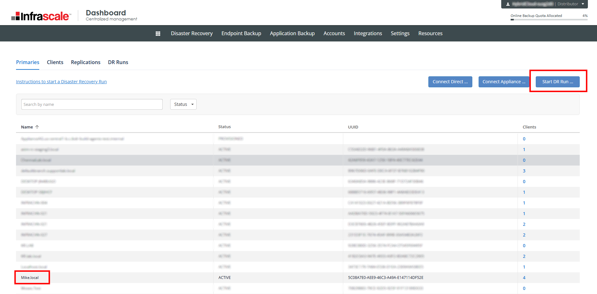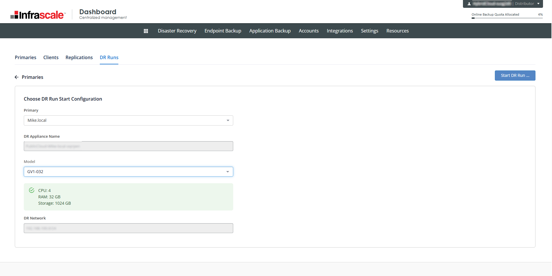 3) Click on the name of the primary appliance that you want to create a DR Run for and click on Start DR Run.